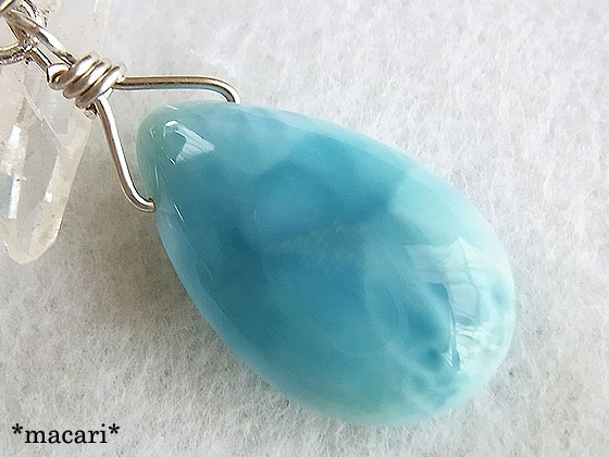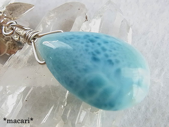 AAAグレードの美しい雫形ラリマーをオリジナルの薔薇にあしらった可愛らしいペンダントです。 お手持ちの細めのネックレスなどに通していただいても、素敵ですよ。 お勧めは、画像のような細めの淡水パールネックレスとの組み合わせです。 清楚な雰囲気が出て、とても可愛らしくなりますよ。 発色もよく、模様も綺麗な高品質ラリマーですが、少し中央に研磨傷が見られるため、価格を低く設定しています。*お使いいただく分には、ほとんど目立たない程度かと思います。