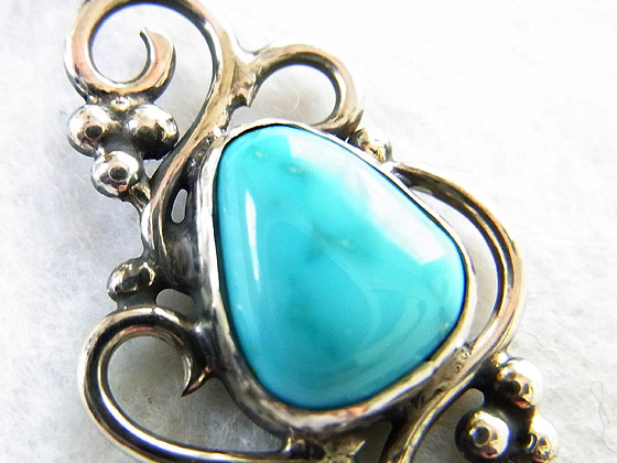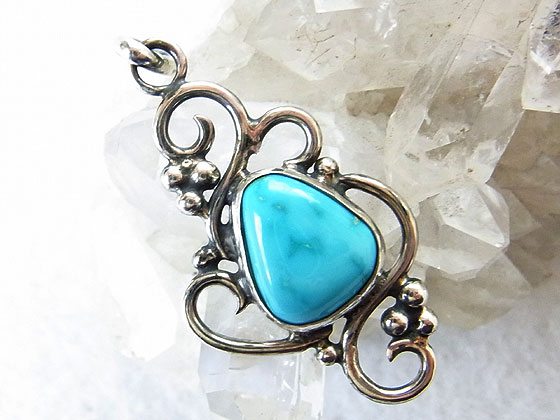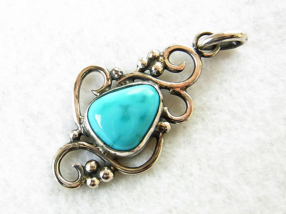 アメリカ ネバダ州 AJAX鉱山で産出した希少なターコイズを唐草デザインのペンダントに仕上げました。 小型のペンダントなので、お使いいただきやすいかと思います。 AJAX鉱山は新しい鉱山で、鉱脈が細く、色合いの美しいターコイズは大変レアだそうです。 こちらのターコイズは大変綺麗なライトブルーですが、若干の色むらが見られますのでご了承ください。 *ターコイズはとても脆い鉱物なので、スタビライズ(樹脂含浸処理)が施されています。