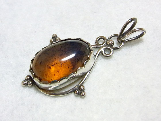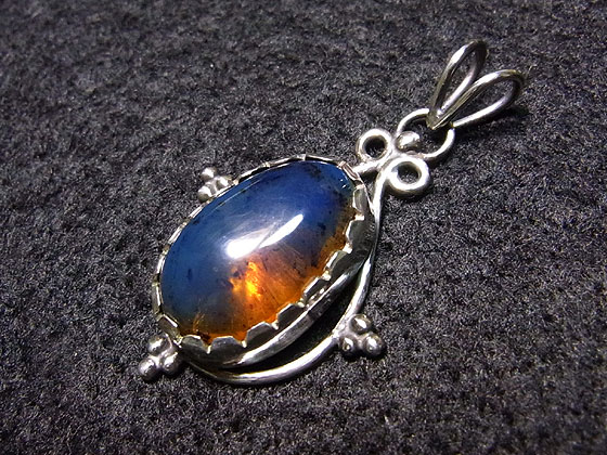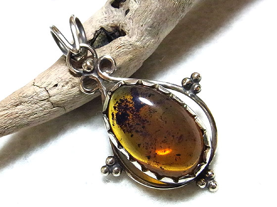 ドミニカ共和国で産出する希少なブルーアンバー(青琥珀)をシルバーでデザインしたペンダントに仕上げました。 ブルーアンバーは紫外線に当たると、青い美しい蛍光をあらわします。 こちらは強蛍光のアンバーなので、背景に黒いものを置いていただくと、太陽光や蛍光灯などでも青く輝く様子がご覧いただけます。