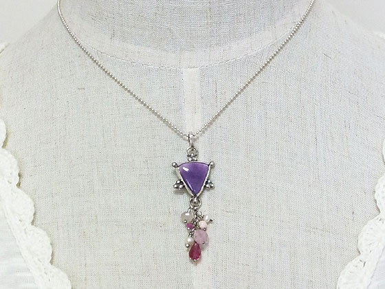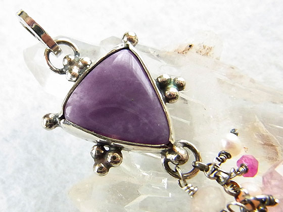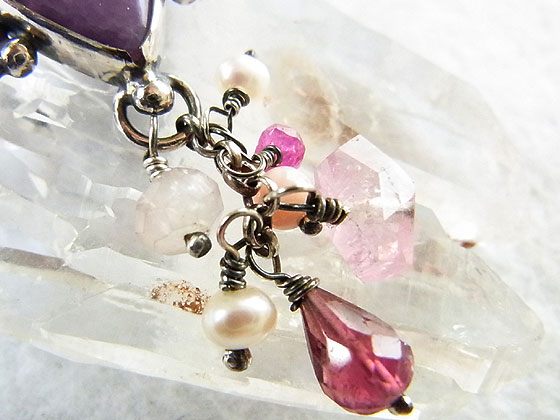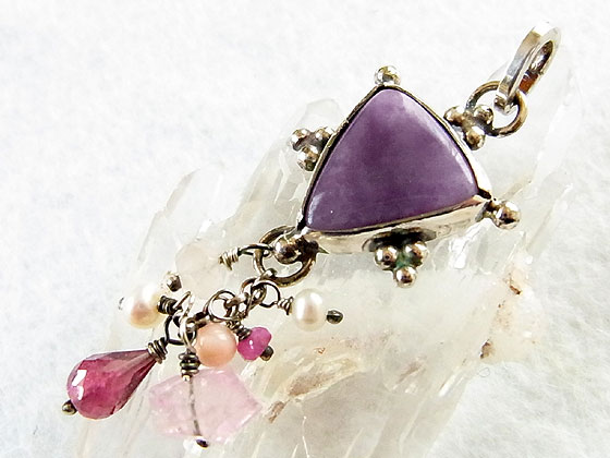 メキシコで産出するパープルオパールをシルバー枠で包み、トルマリンや淡水パールなどのビーズを飾り付けてみました。 パープルオパールは、パープルフローライトがオパール化したもので、オパライズドフローライトやアイスクリームオパールなどの名称で呼ばれることがあります。