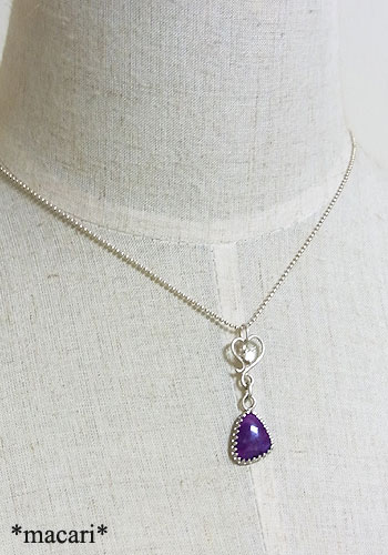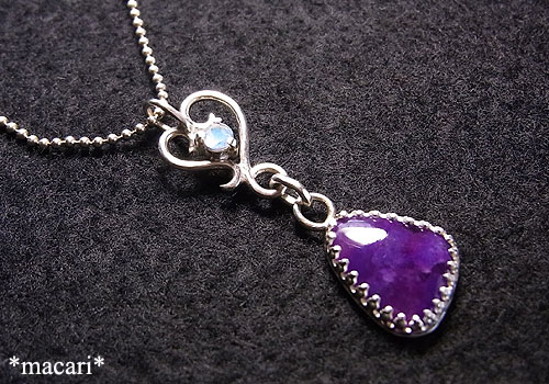 小粒のブルームーンストーン(ラブラドライト)を変形の唐草ハートに飾りつけ、小粒のスギライトを組み合わせた個性的なペンダントに仕上げました。