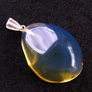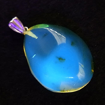 ブルーアンバーのペンダント2 僅かに内包物が見られますが、全体的にクリアなドミニカ産のブルーアンバーを ブルーアンバーは2500〜3000万年前の広葉樹の樹脂が長い年月をかけて化石化したものです。 黒い背景を置いていただくと、日光や蛍光灯の明かりでも青く輝く様子がご覧いただけます。 蛍光する琥珀は大変希少で、こちらのような強蛍光のものは高値で取引されています。 画像3枚目は蛍光灯で撮影。 | |