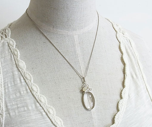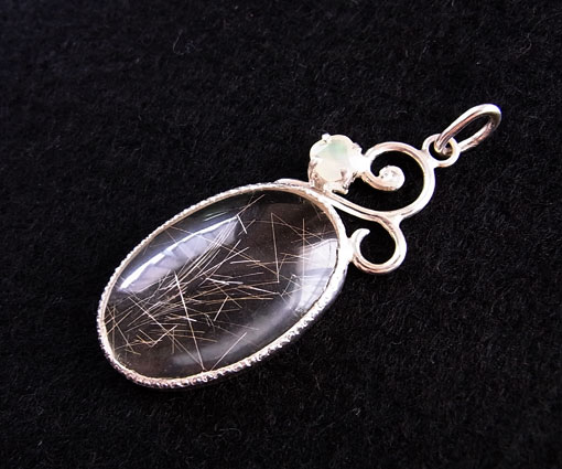 クリアな水晶にシルバーカラーのルチルがキラキラと輝くルースをメインにし、遊色の綺麗な エチオピアオパールを組み合わせた唐草デザインのペンダントに仕上げました。