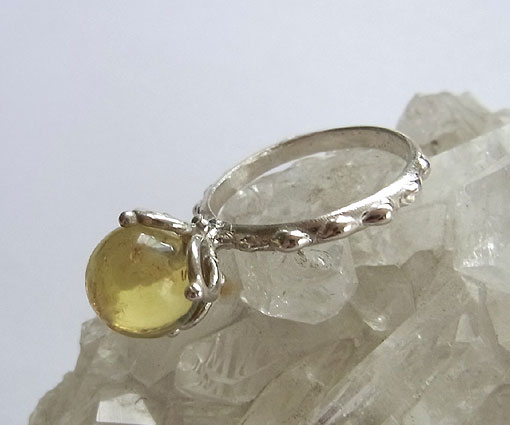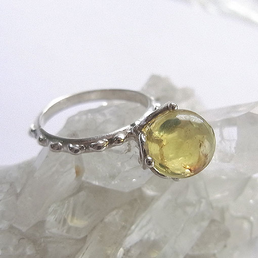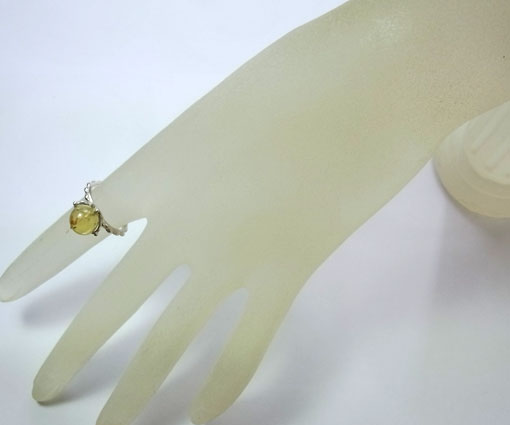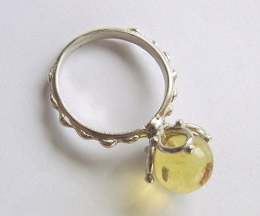 ブルーアンバーのペンダントリング 丸玉のブルーアンバーをペンダントとしてもリングとしても使える リング部分にチェーンを通してペンダントとしてお使いください。 琥珀は柔らかいので、リングとしてお使いになる場合は、強い衝撃を与えないようにご注意ください。 ブルーアンバーは2500〜3000万年前の広葉樹の樹脂が長い年月をかけて化石化したものです。
