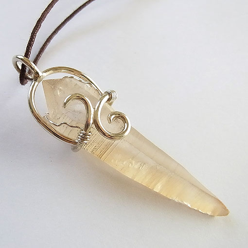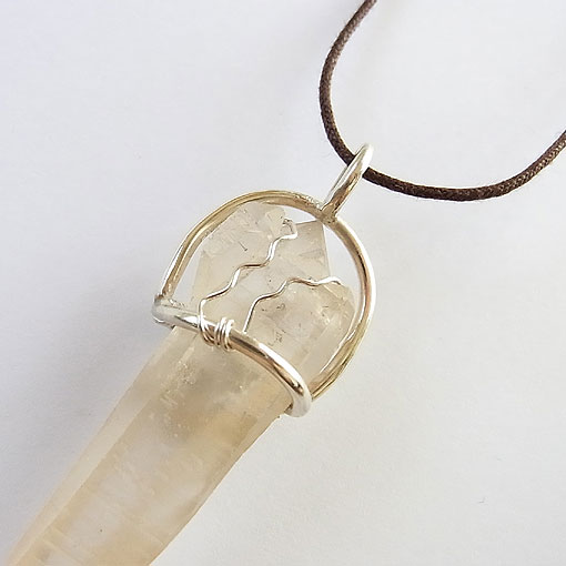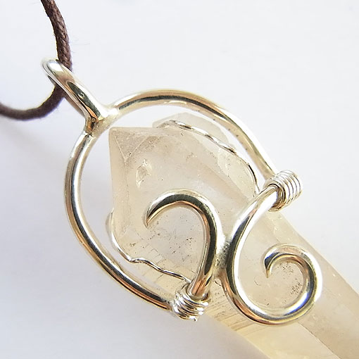 レムリアンシードクリスタルのペンダント ブラジル産のレムリアンシードクリスタルを唐草飾りのペンダントに仕上げました。 表面は、ややすりガラスのように曇っていて、水晶の形もシャープでかなり特徴的です。 こちらの水晶はダブルポイントで、上のほうにはポイントが3つあるという レムリアンシードはアメリカのヒーラーさんがつけた名前で、 大きさがあるので、太目の革紐やチェーンなどに通してお使いくださいね。 | |