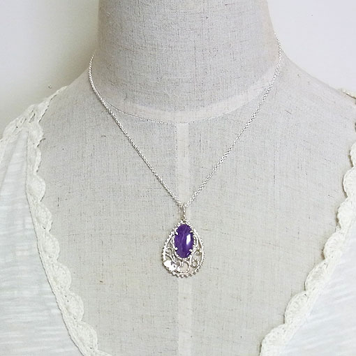 しずく型の縁に唐草をあしらい、小花を一輪飾りつけたデザインに紫色のスギライトを留めてみました。大きさはありますが、重さはありませんのでお使いいただきやすいかと思います。