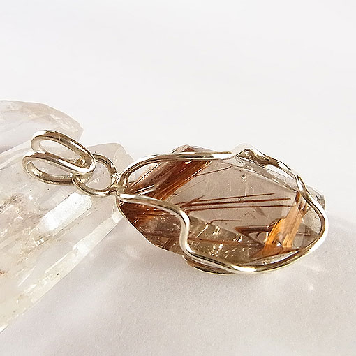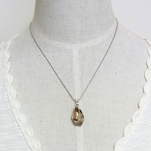 ほんのりスモーキーなカラーの水晶に金色のルチル(金紅石)を内包した面白いカットのルースをシルバーワイヤーで作った籠に閉じ込めたシンプルなペンダントです。