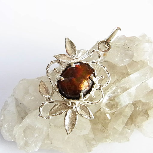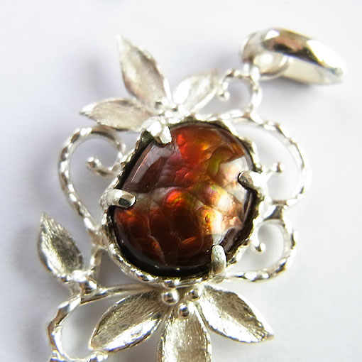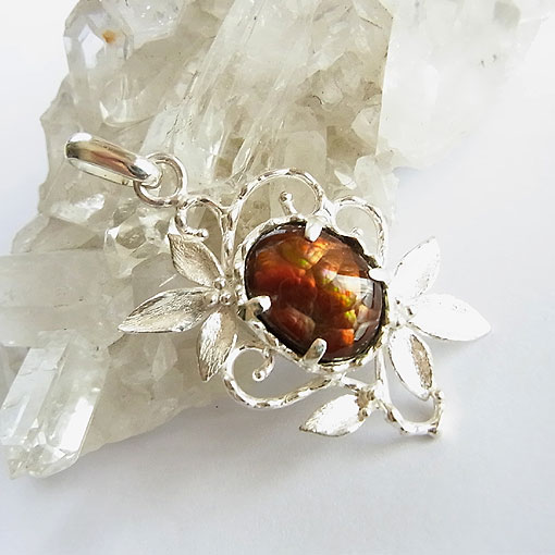 イリデッセンス(虹彩)が浮かぶ希少なファイアーアゲートを 唐草デザインの個性的なペンダントに仕上げました。
