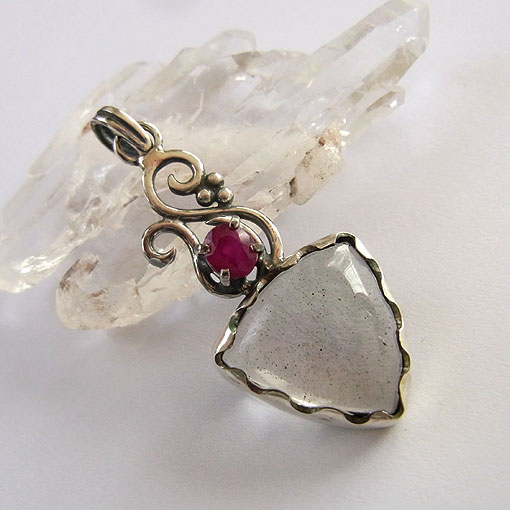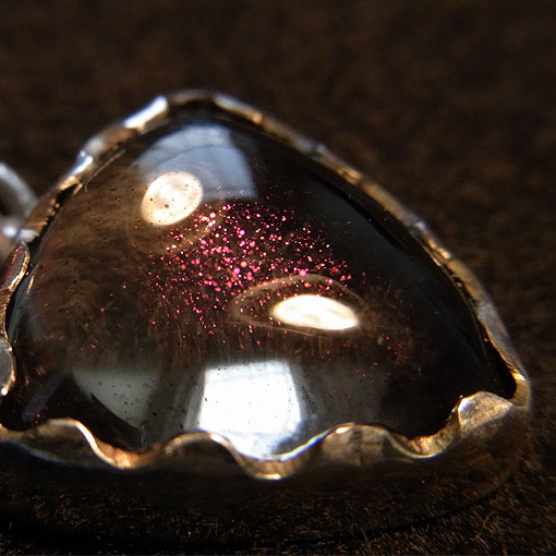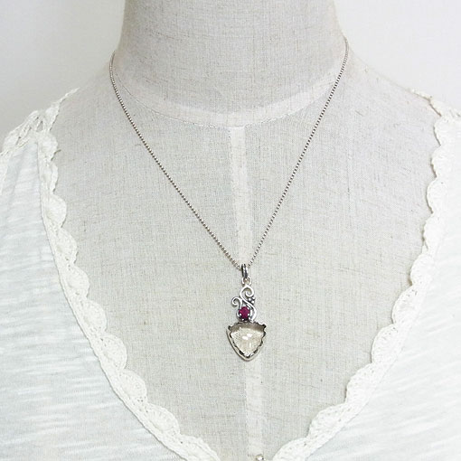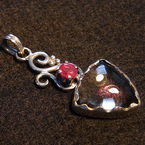 細かなインクリュージョン(内包物)が光に当たると、鮮やかなピンクの輝きを浮かべるピンクファイアークォーツと鮮やかな赤いルビーを組み合わせた個性的な雰囲気のペンダントです。