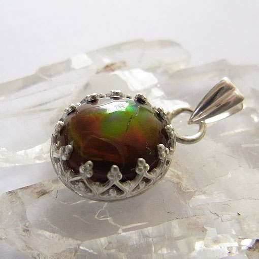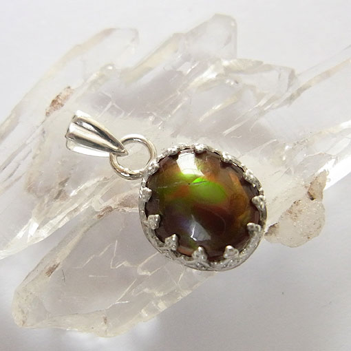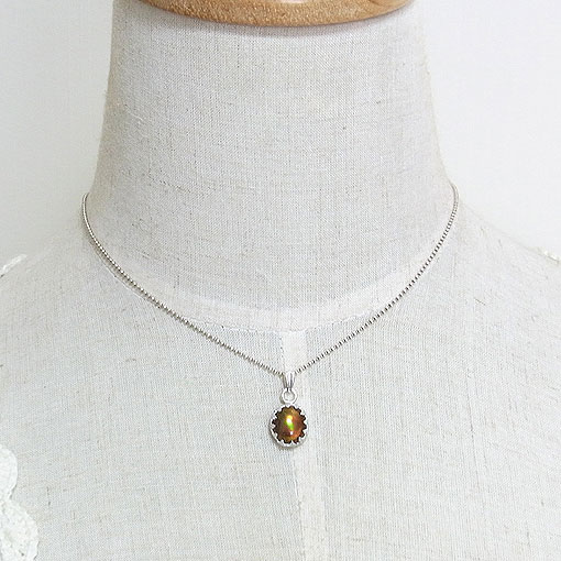 イリデッセンス(虹彩)が美しいファイアーアゲートをレース状の飾り枠で留めたシンプルなペンダントです。