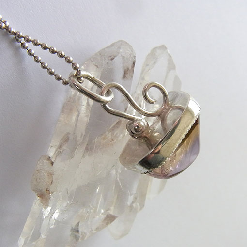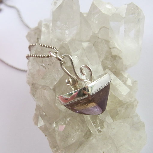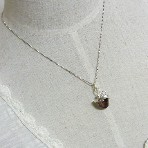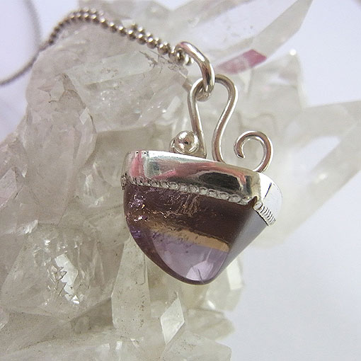 アメシストとシトリンが混在した面白い形のタンブルをシルバーの飾りで留めたペンダントに仕上げました。 光にかざすと、内部のクラックがキラキラと輝き、とても綺麗です。