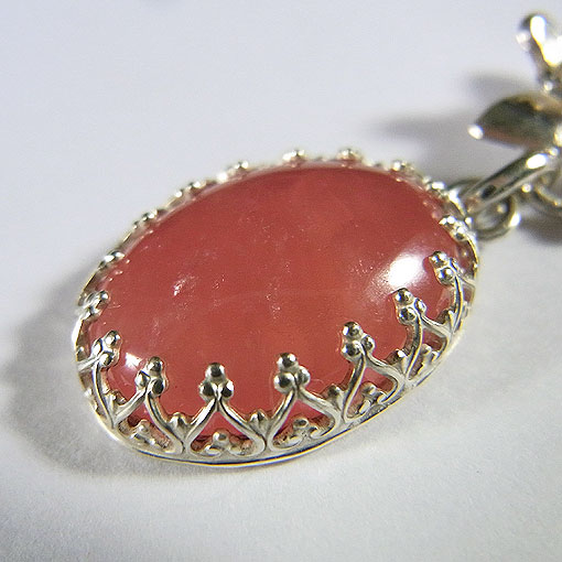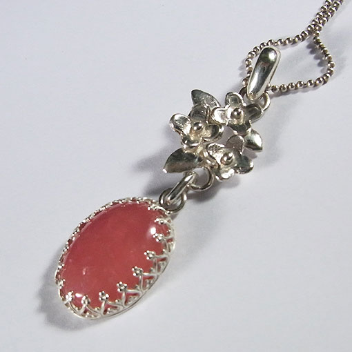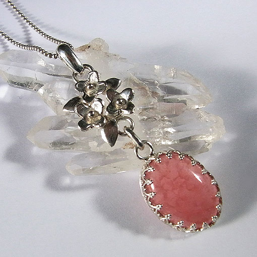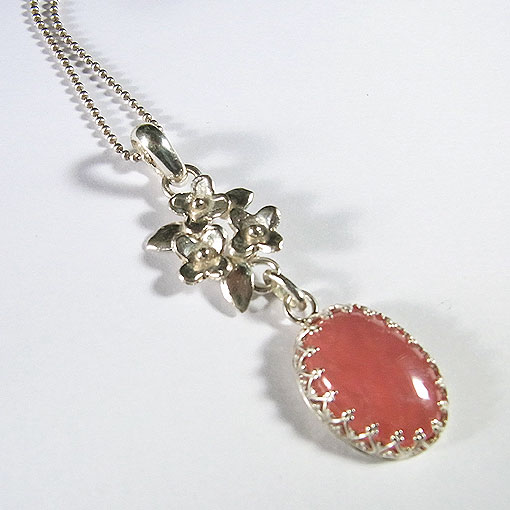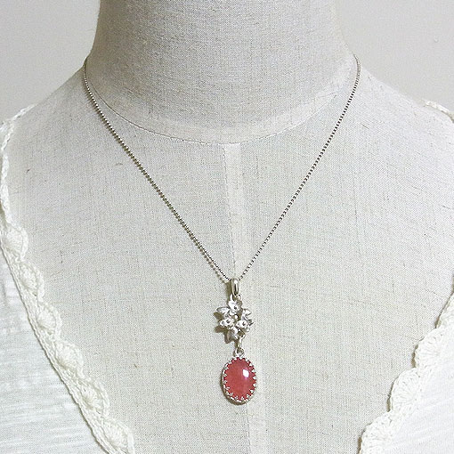 オレンジピンクの鮮やかな色合いが美しいインカローズを小花飾りに組み合わせた 愛らしいペンダントに仕上げました。 インカローズにの内部に小さなクラックが見られますが、 それが光に当たるとチラチラと輝き、とても綺麗です。