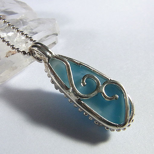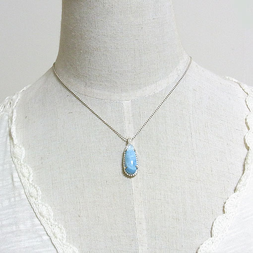 発色の美しいラリマーを石枠の縁に粒飾りをあしらったペンダントに仕上げました。 こちらはグレード付けはありませんが、色合いとしてはAAA-グレードとさほど変わらないかと思います。 上の部分に白い箇所が見られるため、予めご了承ください。