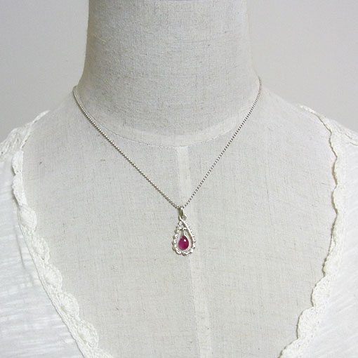 トロッとしたテクスチャーをつけた飾り枠にルビーのブリオレットを一粒飾り付けたペンダントです。 両面に同じテクスチャーを施していますので、どちらでもお使いいただけます。