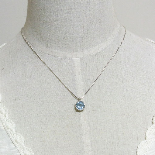 発色のよいアクアマリンの粒飾りのシンプルなペンダントに仕上げました。 少しインクルージョンやクラック見られますが、大変美しいアクアマリンです。