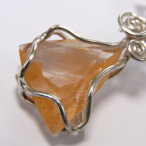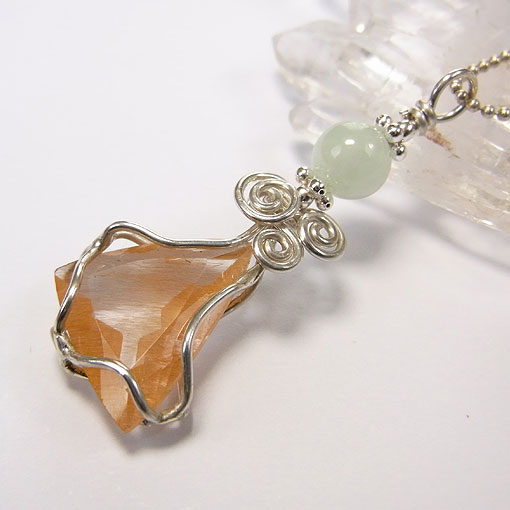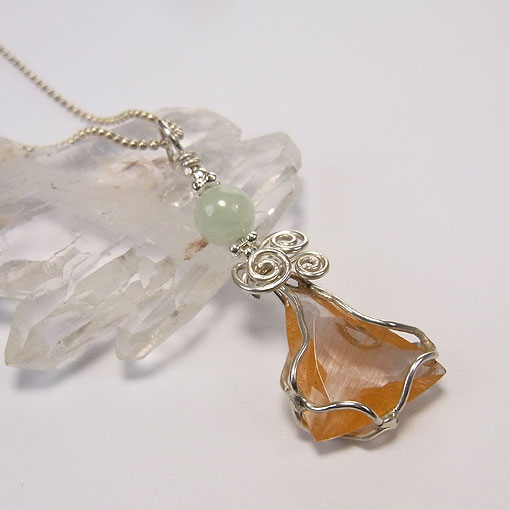 カットの面白いリモナイトイントパーズを銀線で包み、翡翠のビーズを組み合わせた 遊び心のあるペンダントです。