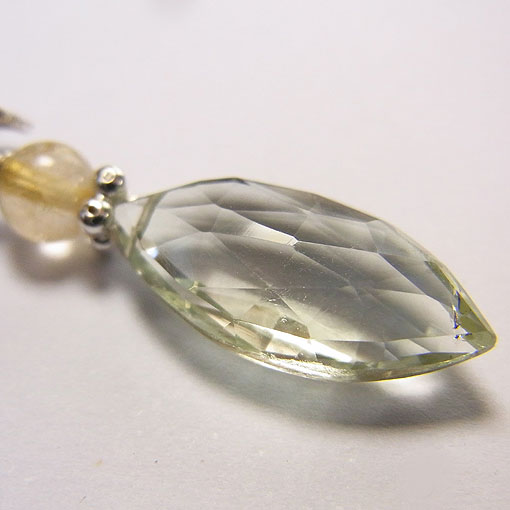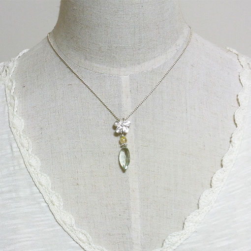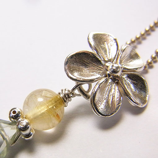 グリーンアメシストフラワーペンダント 可憐なオリジナルのフラワーモチーフに大粒のグリーンアメシストと小さなルチルクォーツを飾り付けた