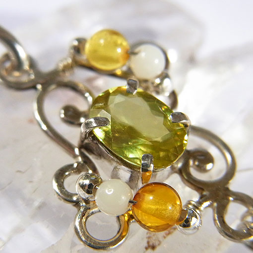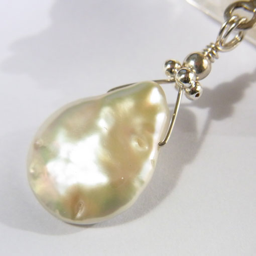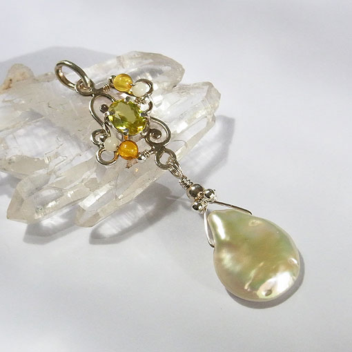 スフェーンと淡水パールのペンダント イエローグリーンのスフェーンを銀線であしらった唐草飾りに留め