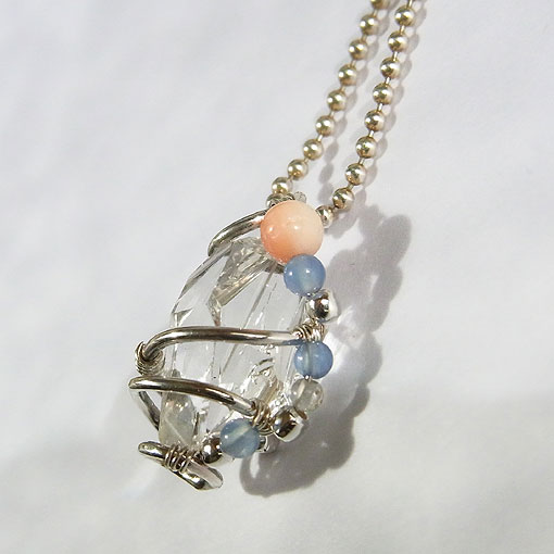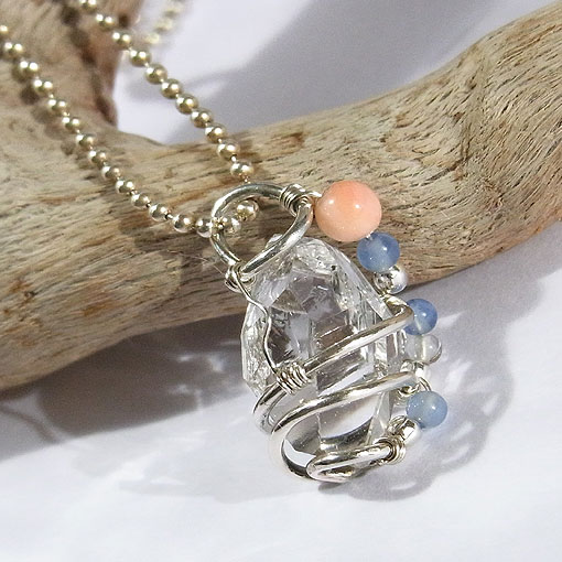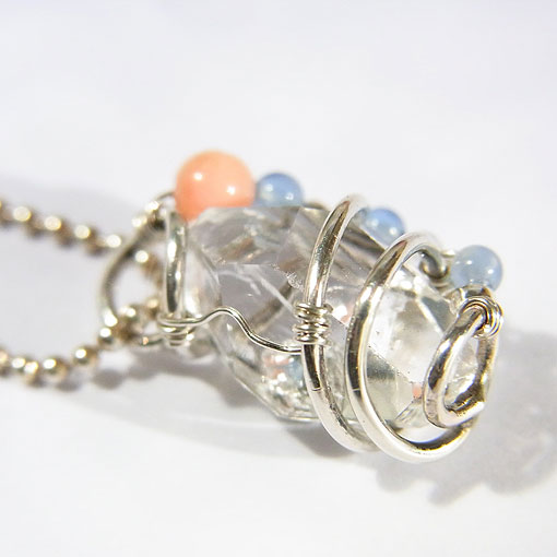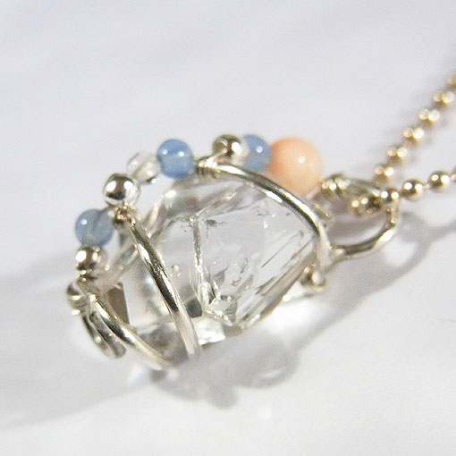 ハーキマーダイヤモンドの螺旋ペンダント 透明度が高く、硬質な輝きが美しいハーキマーダイヤモンド(水晶)を 一部群生から剥がれた跡が見られますが、どの面から見てもキラキラと輝き、とても綺麗です。