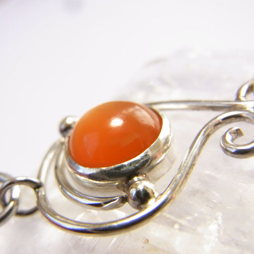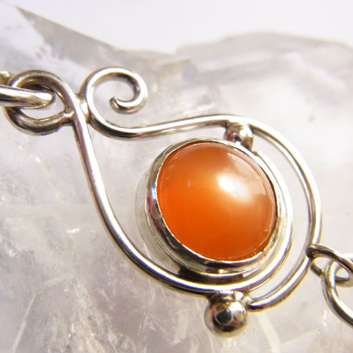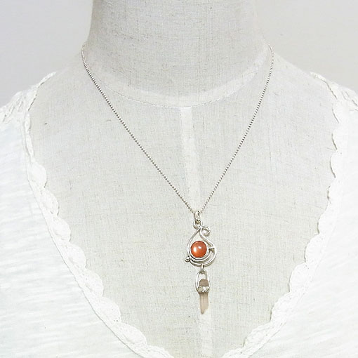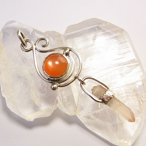 オレンジムーンストーンとチベット水晶のペンダント 濃いオレンジ色が元気をくれそうなムーンストーンと オレンジムーンストーンには白い部分も見られますが、キャッツアイも浮かび輝きが綺麗です。 チベット水晶は鉄分の影響で、ほんのり赤っぽくなっています。
