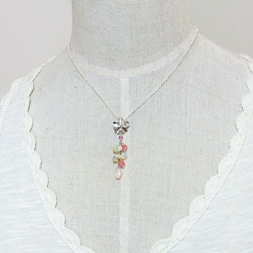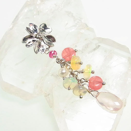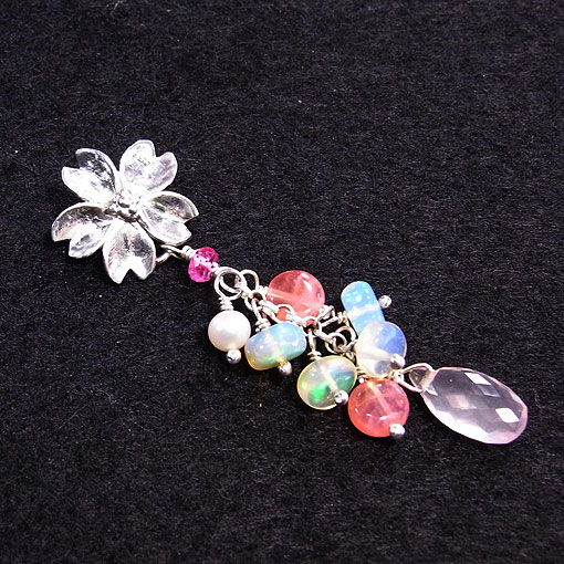 桜ペンダント 2 銀で作った桜の飾りに各種天然石のビーズを飾り付けた愛らしく可憐な印象のペンダントです。 桜は型どりではなく手作業で制作したものになります。 *桜ペンダント1よりオパールを増やしているので、若干お値段が高くなっています。