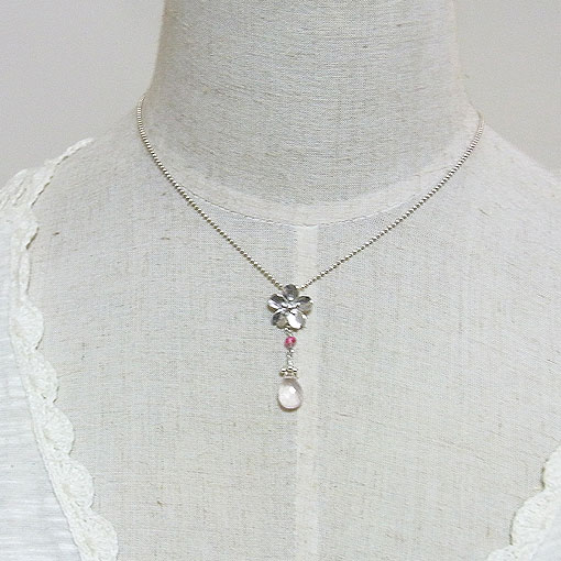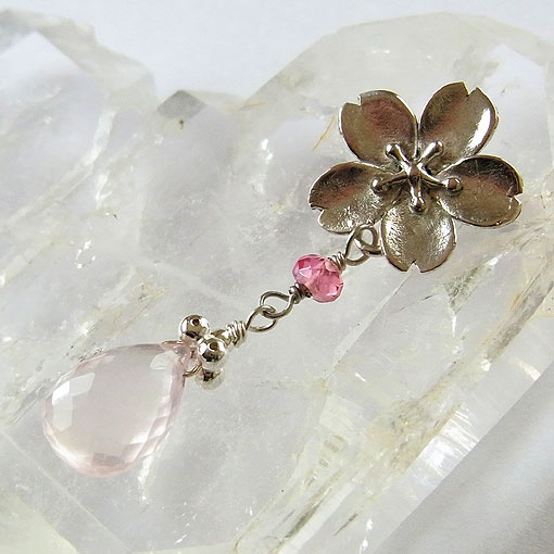 銀で作った桜の飾りにローズクォーツのビーズを飾り付けた愛らしく可憐な印象のペンダントです。