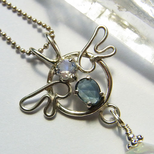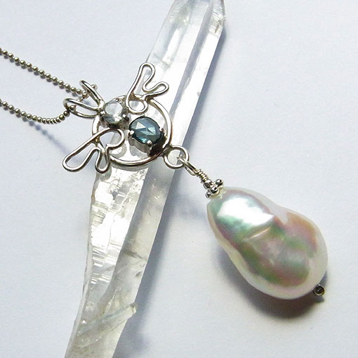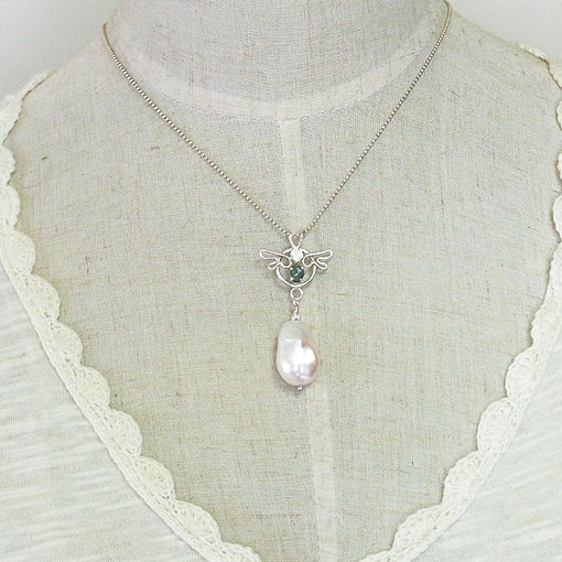 小さな翼を添えたシルバー飾りにサファイアとホワイトラブラドライトを留め オーロラのような光沢が美しい肉厚のバロック淡水パール を組み合わせた個性的なペンダントです。