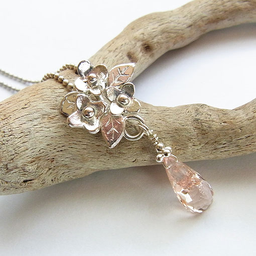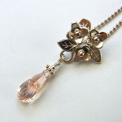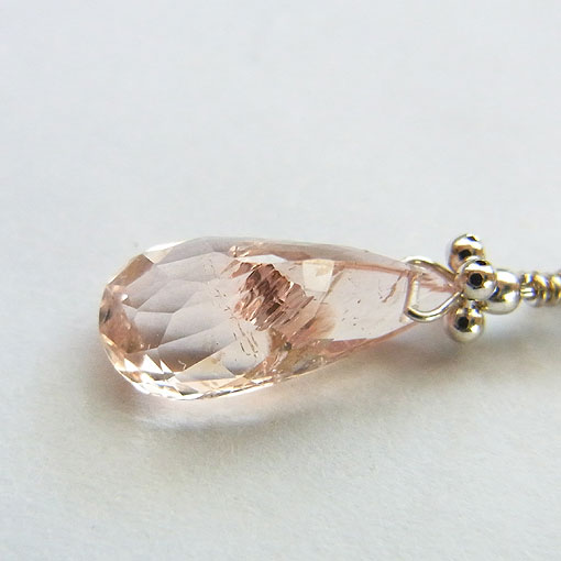 淡いピンクのモルガナイトを小花飾りの可愛らしいペンダントに仕上げました。 モルガナイトはエメラルドやアクアマリンなどの緑柱石(ベリル)グループの石で、マンガンが起因して | |