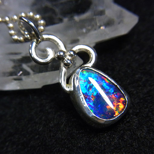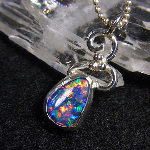 遊色の大変美しいオパールを小さな唐草を乗せた可愛らしいペンダントに仕上げました。 こちらのオパールは黒い台に張り合わせたダブレットと呼ばれるものになります。 後ろに黒い背景があるので、通常のオパールよりも色合いが鮮やかに見られます。 オパールの中心にクラックがありますので、価格設定を少しお安くしています。