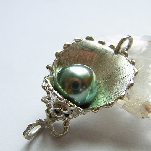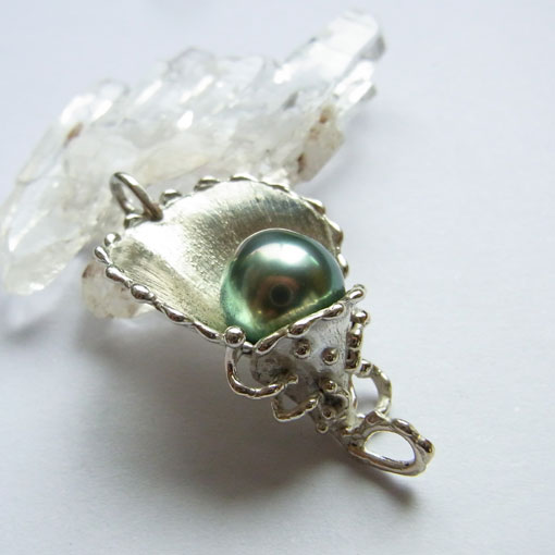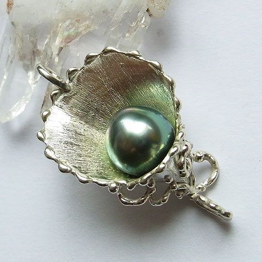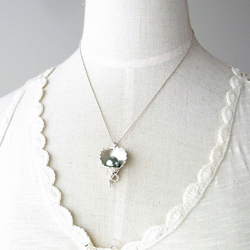 植物をイメージしたデザインに南洋黒蝶真珠を飾り付けた個性的なペンダントです。