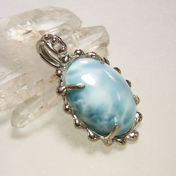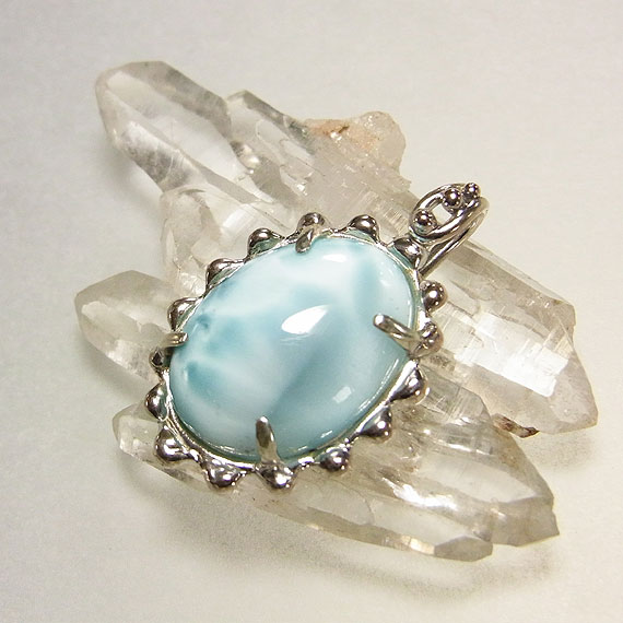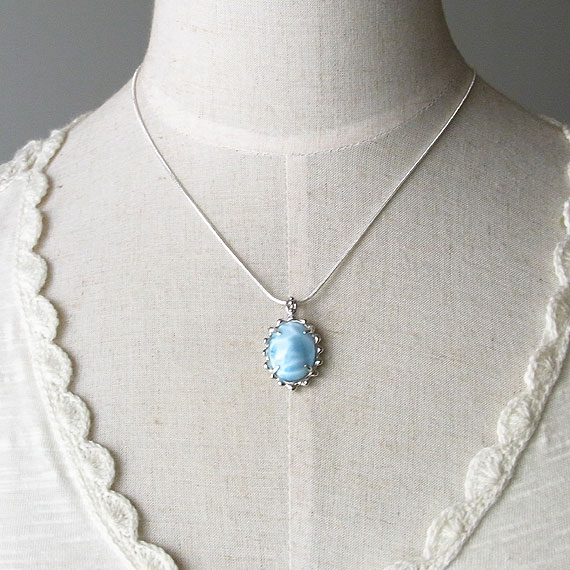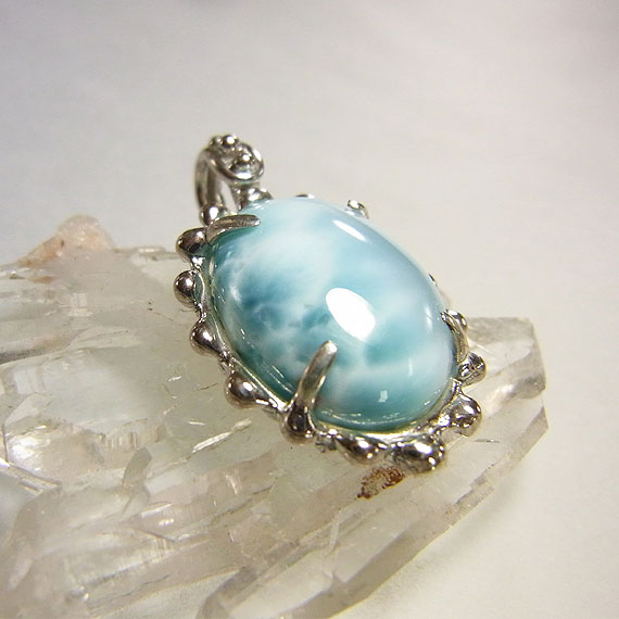 ラリマーのペンダント(オーバル) シルク光沢の強いラリマーを石枠に艶のあるテクスチャをつけた 角度によって色の濃淡が違って見える面白いラリマーです。 *ラリマー* |