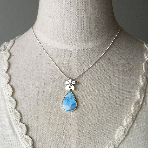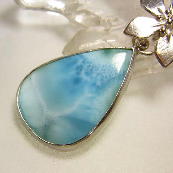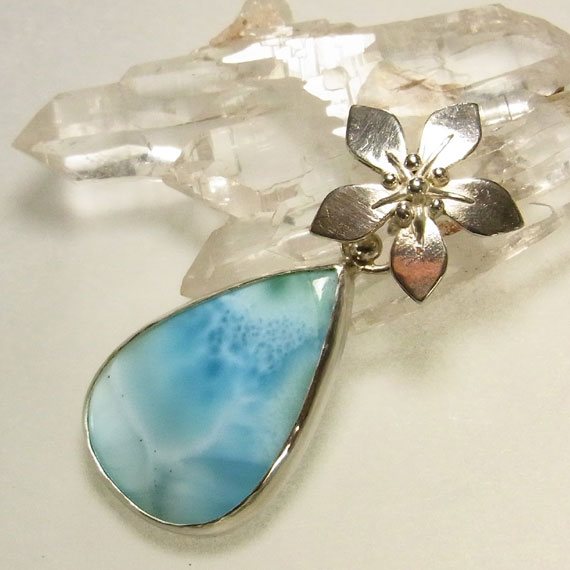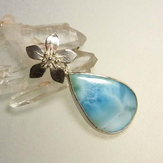 ラリマーのお花ペンダント 模様の綺麗なラリマーを艶消しの花バチカンに飾り付けたペンダントです。 *ラリマー* |