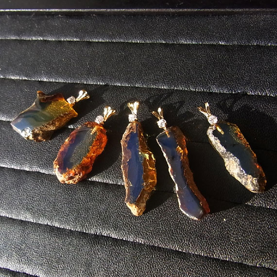 ブルーアンバースライスペンダント 5 ブルーアンバーの原石を両面磨いただけの個性的なペンダントです。 *ブルーアンバー* 誠に申し訳ございませんが、何卒ご了承ください。 原石スライスは今回アップした5点のみとなります。 次回入荷は未定です。