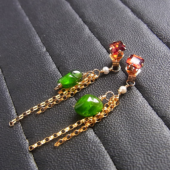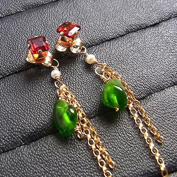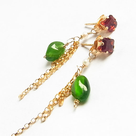 鮮やかな赤いスクエアのガーネットにエメラルドグリーンのクロムダイオプサイドと *キャッチに飾りがついていますので、シンプルなスタッドピアスとしてお使いいただけるように
