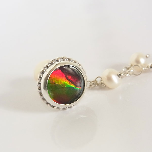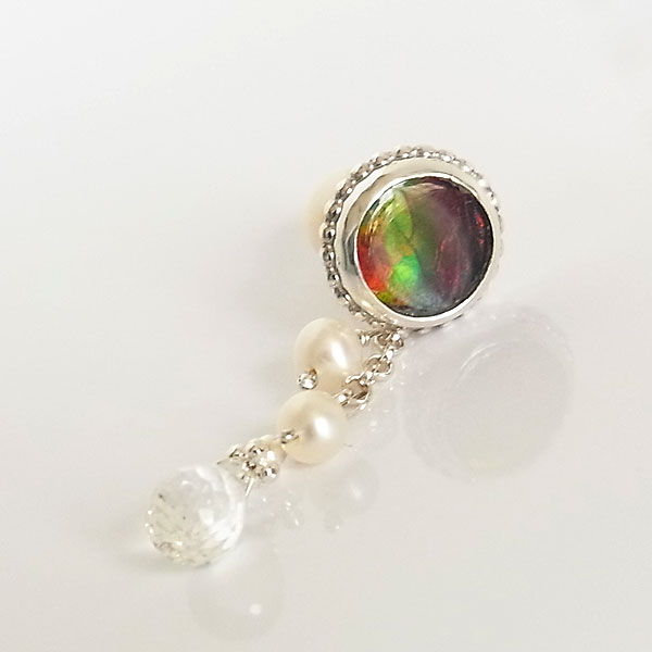 七色の輝きが美しいアンモライトと水晶のダブレットを片耳用のピアスに仕上げました。