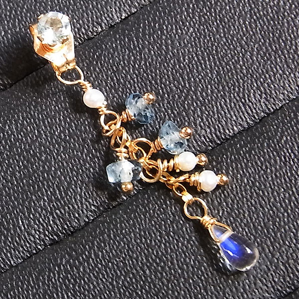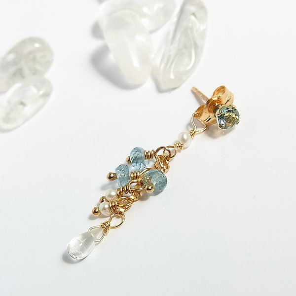 輝きが美しい小粒のアクアマリンのスタッドピアスにホワイトラブラドライトや キャッチ部分にビーズ類を繋げてありますので、シンプルなスタッドピアスとしてもお使いいただけるように