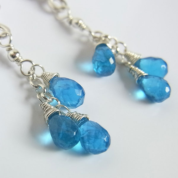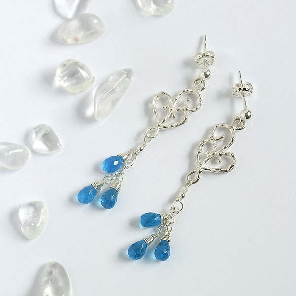目が覚めるような鮮やかなネオンブルーのアパタイトをオリジナルの唐草パーツに飾り付けたピアスです。