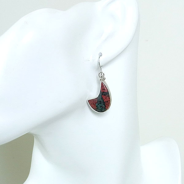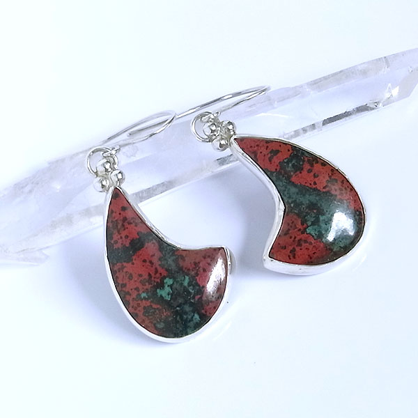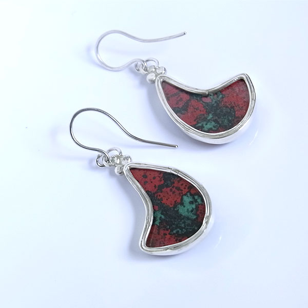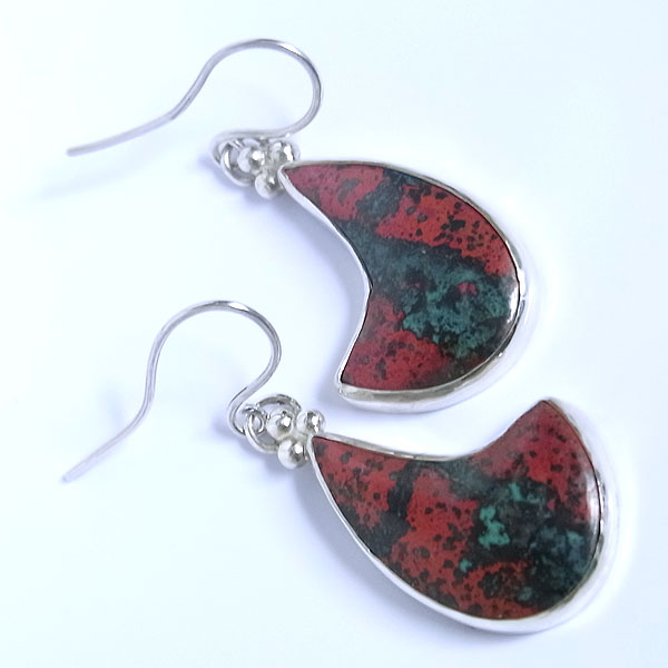 燃えるような赤に緑や黒が混ざり合った個性的な模様のソノラ・サンライズという石を 三日月を崩したような面白い形状ですよ。
