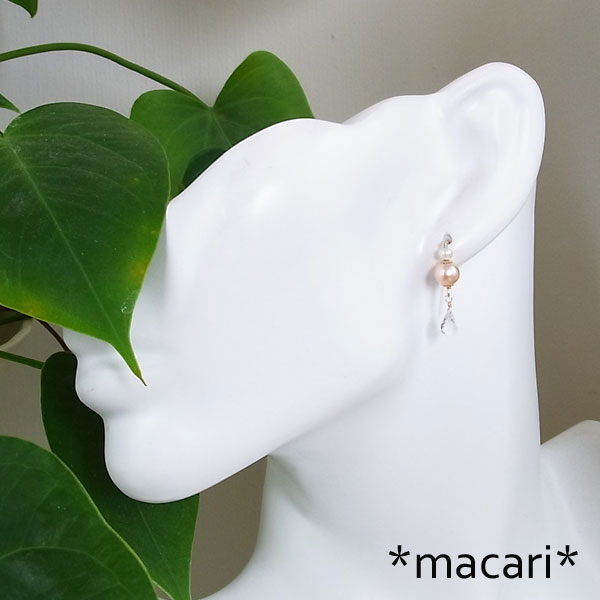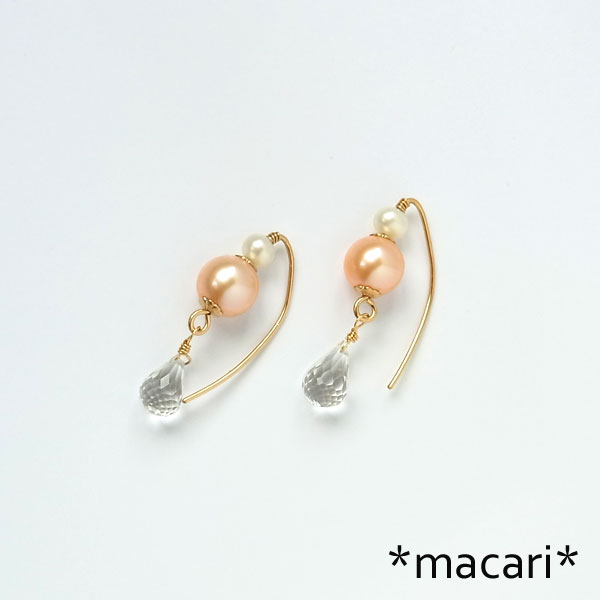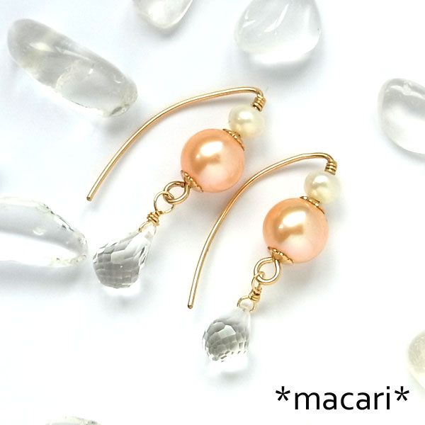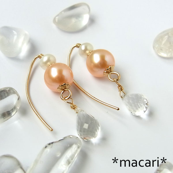 オレンジ系の艶の美しい淡水パールと水晶のブリオレットを組み合わせたシンプルなピアスです。 オレンジ系ですが、自然色なので光の加減で色合いの雰囲気がかなり違って見られます。 金具は短めに作っていますので、パールの部分が耳たぶにフィットするような感じになります。