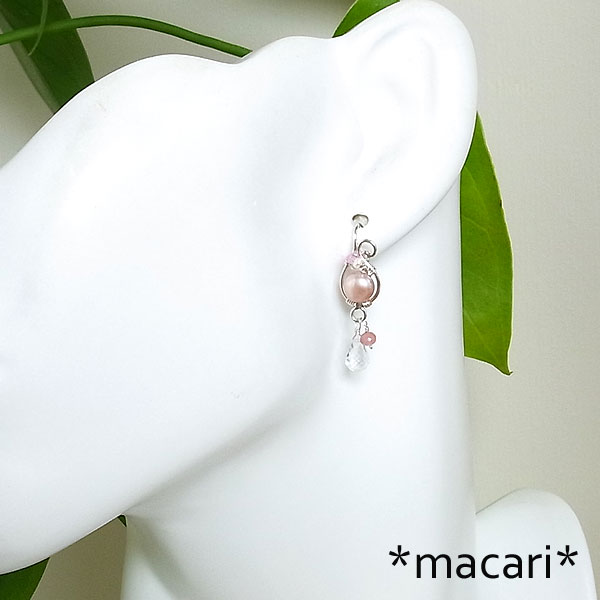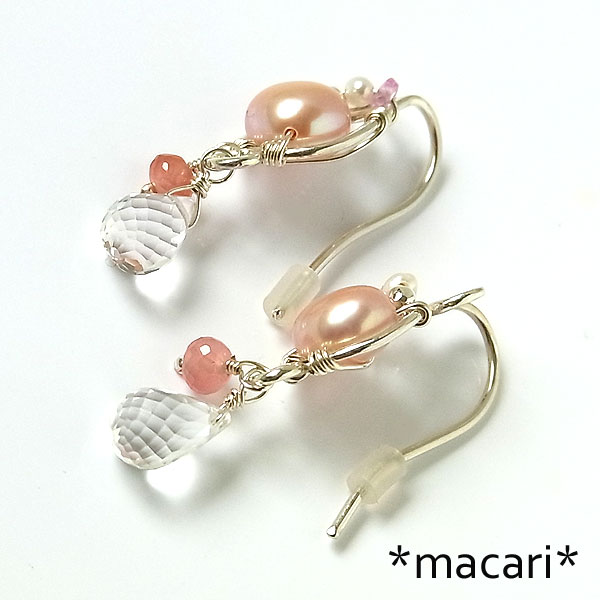 ローズピンクの可愛らしいフラット型淡水パールを 銀線で作り上げたピアス金具に留め、水晶、インカローズ、ピンクサファイアを飾り付けたピアスです。