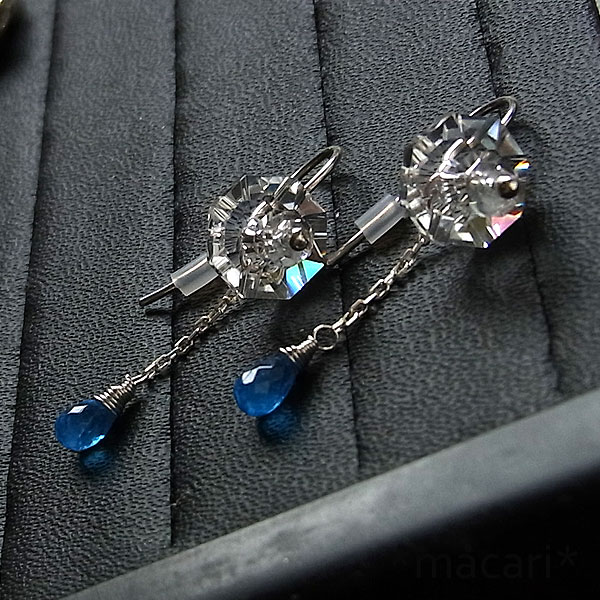 輝きの美しい水晶のボタンカットビーズに鮮やかなネオンブルーのアパタイトを組み合わせた ネオンブルーアパタイトの部分は取り外しができるので、シンプルな水晶のピアスとしてもお使いいただけますし、 水晶のカットが綺麗なので、角度によってプリズム効果も見られますよ♪ *アパタイト* 黄色、青色、緑色、無色のものがあり六角柱状や円柱状の結晶として産出するカルシウムのリン酸塩鉱物。 こちらの様な鮮やかなブルーは珍しく、ビーズに使用されている石としては大変質も良いものになります。 *僅かにクラックが見られますのでご了承ください。 |