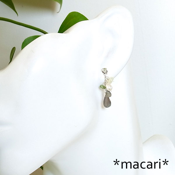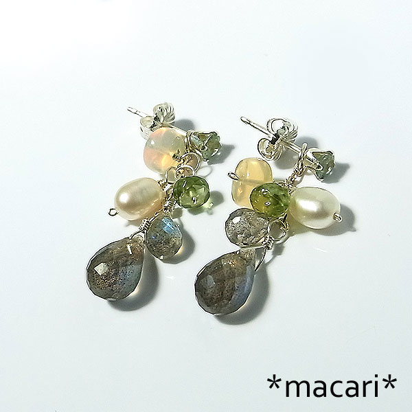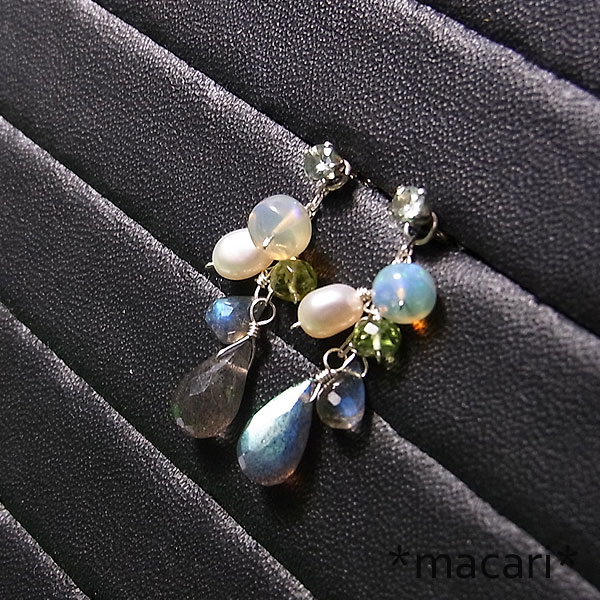 小さな淡いグリーンサファイアスタッドピアスにラブラドライトやオパール、アパタイトなどを飾り付けた 華やかな印象のピアスです。 ラブラドライトは光の当たる角度によってブルーやグリーンの美しい輝きを浮かべます。