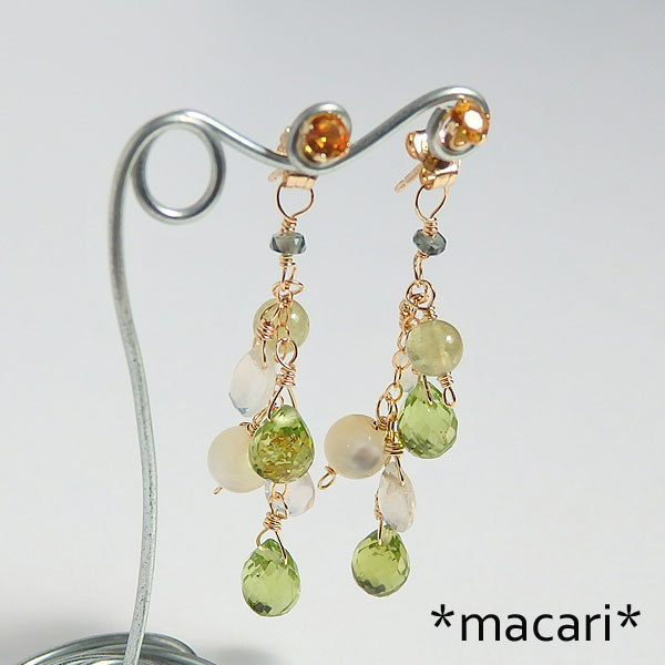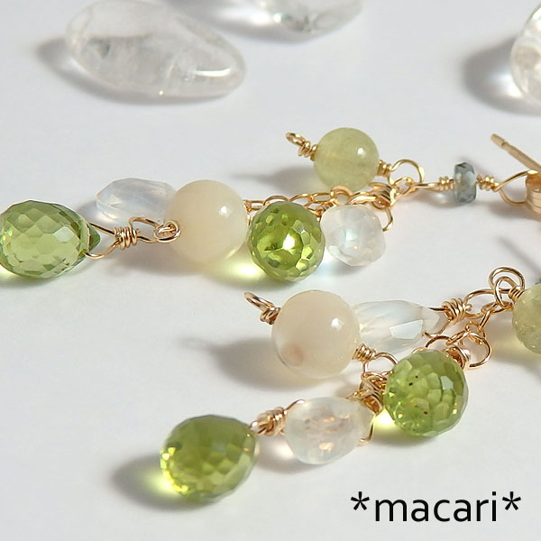 ペリドット、セイロンムーンストーンなどを飾り付けた輝きの美しいピアスです。