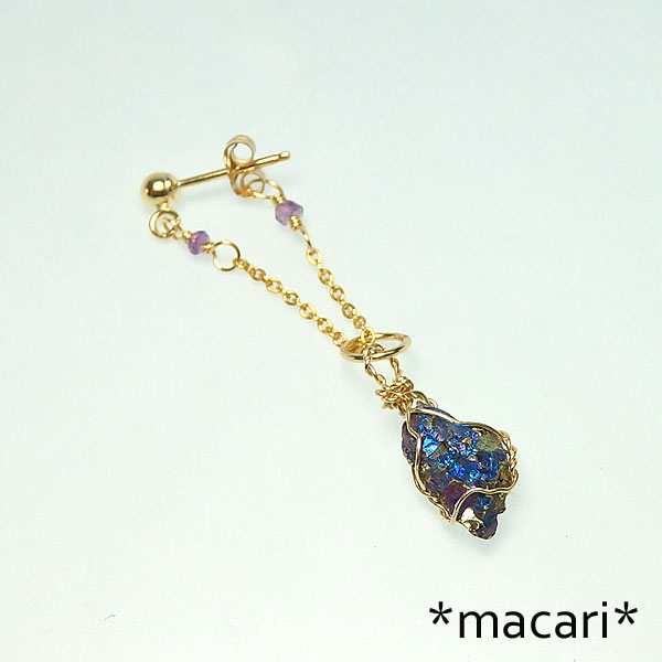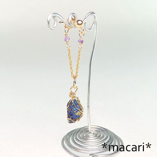 ブルーやゴールドの輝きが美しいカルコパイライト(黄銅鉱)のかけらを k14GFワイヤーでシンプルに巻いてピアスに仕上げました。