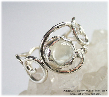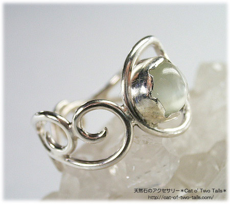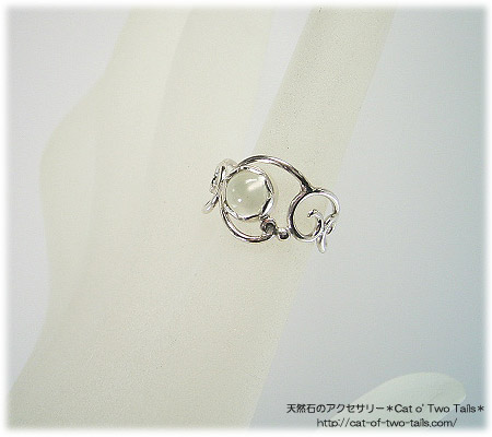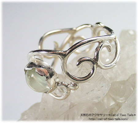 透明感がある柔らかい輝きが優しげな印象のグリーンムーンストーンを唐草飾りのリングに仕上げました。