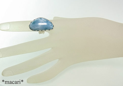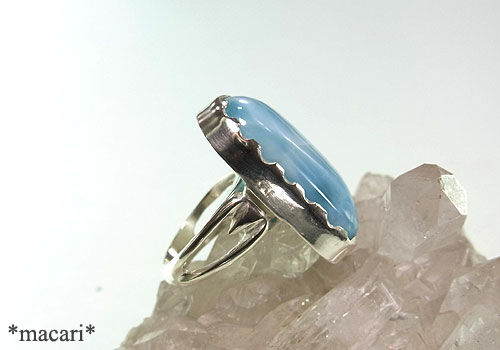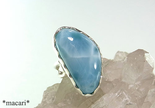 大変大粒で存在感のある美しいラリマーを、サイドにシャープなハートモチーフをあしらったリングに仕上げました。薄っすらクラックのような筋が見られますが、あまり目立ちません。模様も綺麗で、シルク光沢もあり、身に付けるととても目を惹くと思います。^^