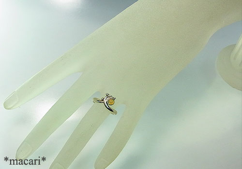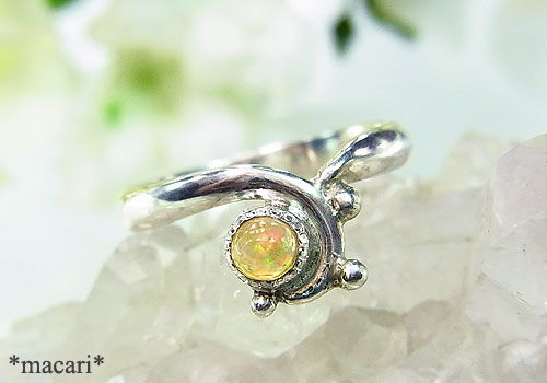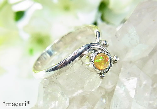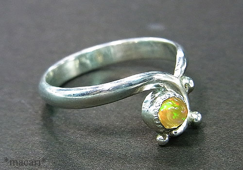 オレンジの地色にグリーンや赤みを帯びた遊色を放つ美しいメキシコオパールを可愛らしいリングに仕上げました。なんとなく、曲線が恐竜の尻尾っぽく見えるのですが・・・私だけでしょうか?(笑)