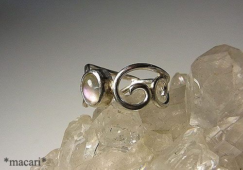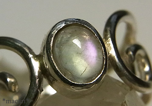 ピンクの輝きが綺麗な小粒のホワイトラブラドライトを唐草飾りのピンキーリング(小指用)に仕上げました。