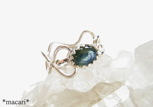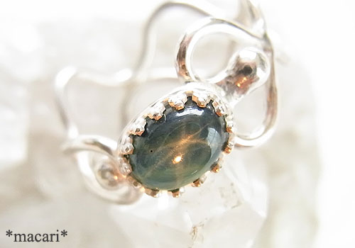 ブルーグレーのサファイアに6条のスターが浮かび上がるスターサファイアを個性的で華奢なデザインのリングに仕上げました。色むらがあり、裏側の内包物による凹みがあります。こちらのサファイアは拡散加熱処理を施されたものになります。