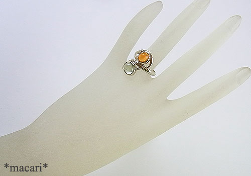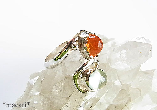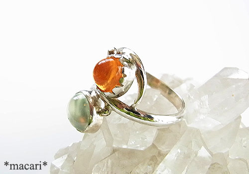 オレンジ色のメキシコオパールとマスカットのようなカラーが可愛いプレナイトを上下で組み合わせた個性的なリングです。オパールの遊色が少し弱めなので、ご了承ください。*太陽光などでは綺麗に遊色が浮かびます。